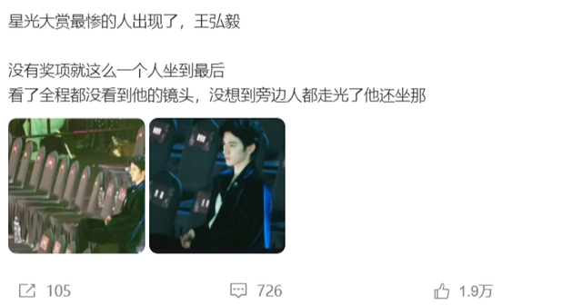 紧接着,网上出现一张照片,王弘毅孤零零地坐在台下,看到这样的情况,很多网友都忍不住问:王弘毅拿完奖没走吗?原来,王弘毅并没有获奖,也没有获得过多的镜头,只是孤零零地留到最后。